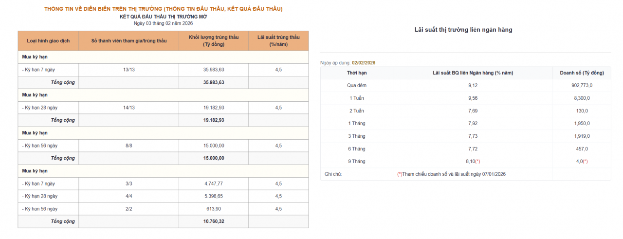 Theo đó, ngày 3/2, trên kênh cầm cố, Ngân hàng Nhà nước chào thầu 60.000 tỷ đồng ở kỳ hạn 7 ngày; 37.000 tỷ đồng ở kỳ hạn 28 ngày và 21.000 tỷ đồng ở kỳ hạn 56 ngày, lãi suất đều ở mức 4,5%.