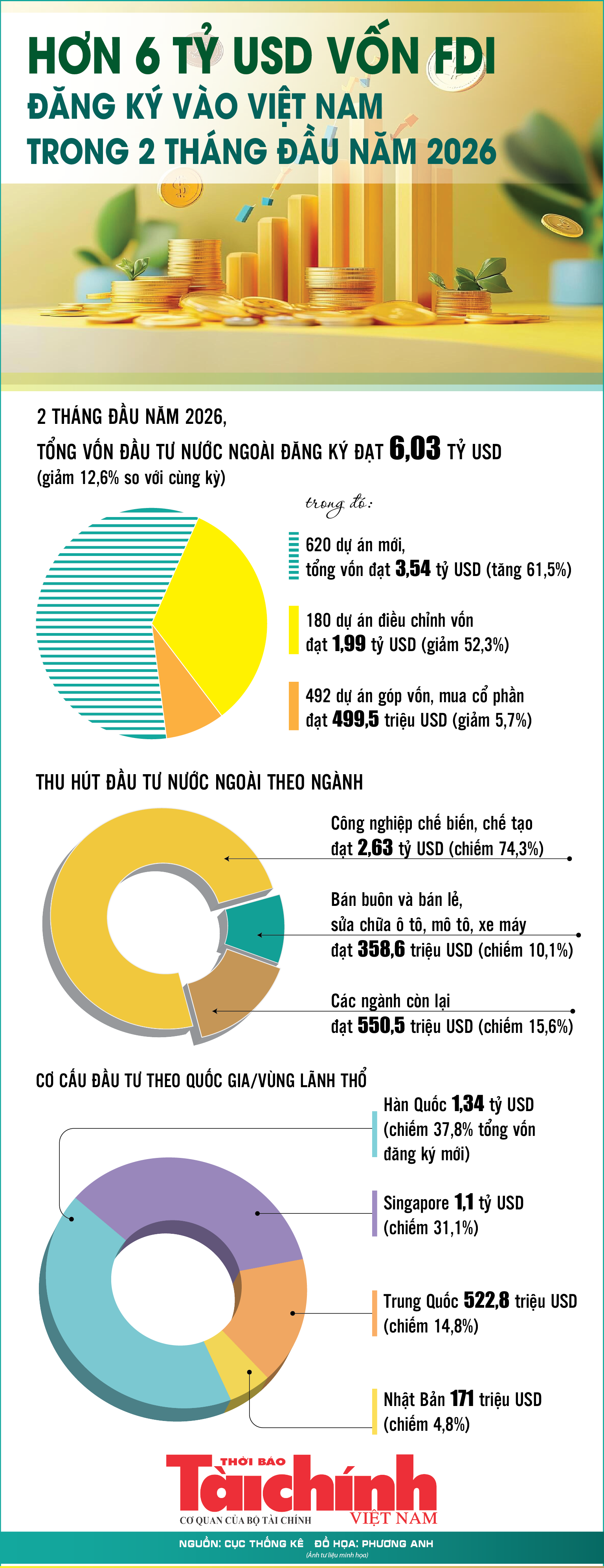 Theo Cục Thống kê (Bộ Tài chính), trong 2 tháng đầu năm 2026, tổng vốn đăng ký cấp mới, điều chỉnh và góp vốn, mua cổ phần của nhà đầu tư nước ngoài tại Việt Nam đạt 6,03 tỷ USD, giảm 12,6% so với cùng kỳ năm trước.