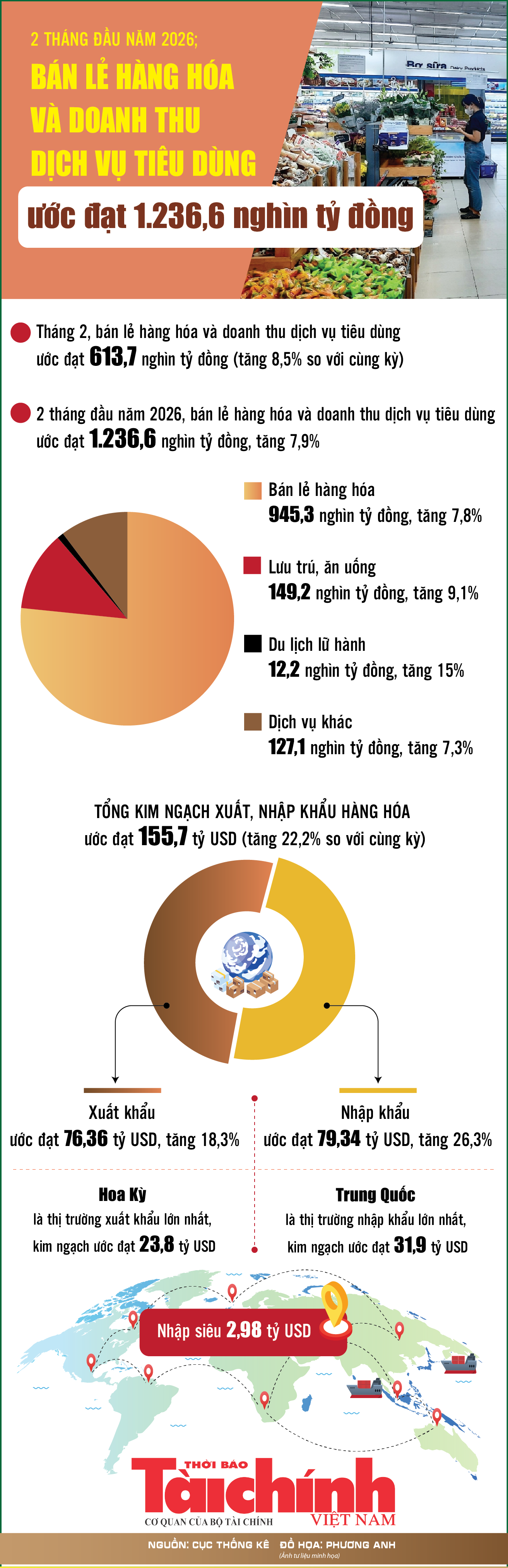 Theo Cục Thống kê (Bộ Tài chính), 2 tháng đầu năm 2026, tổng mức bán lẻ hàng hóa và doanh thu dịch vụ tiêu dùng theo giá hiện hành ước đạt 1.236,6 nghìn tỷ đồng, tăng 7,9% so với cùng kỳ năm trước.
