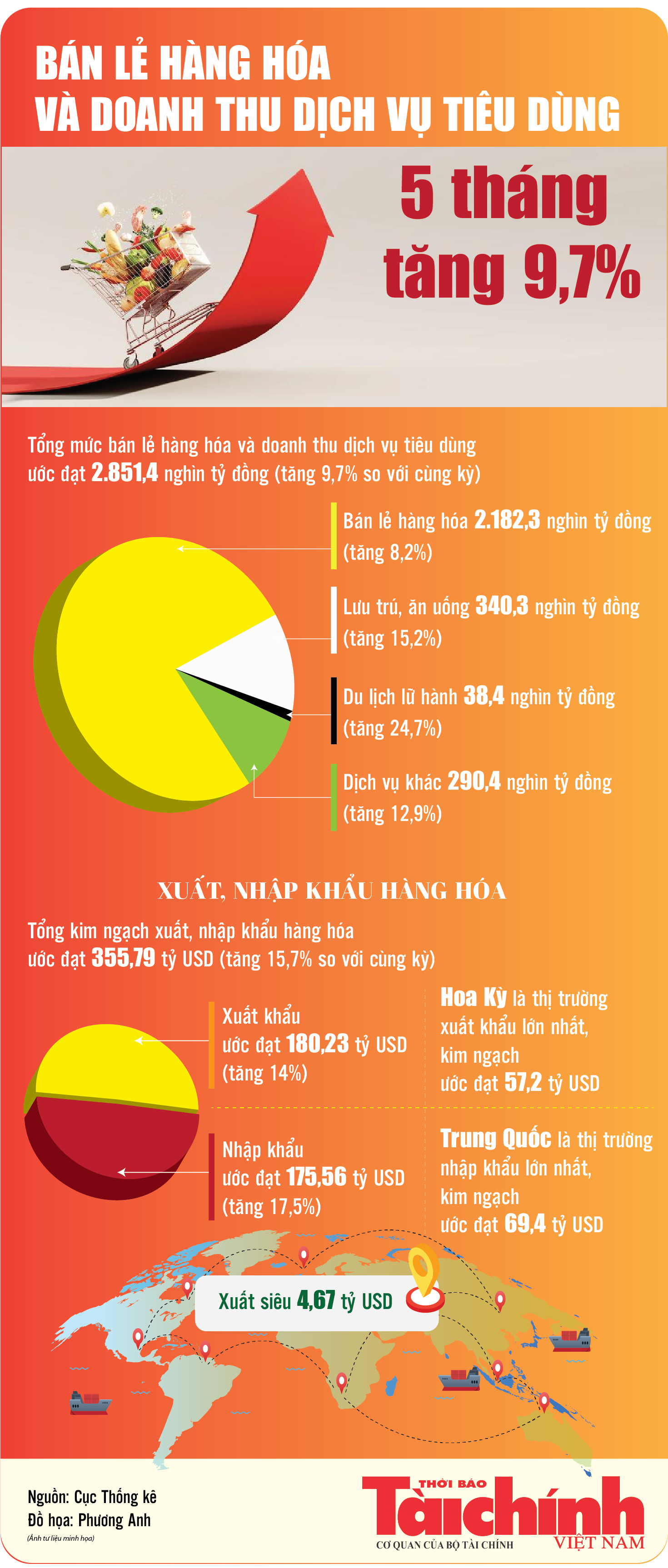 Theo Cục Thống kê, 5 tháng đầu năm 2025, tổng mức bán lẻ hàng hóa và doanh thu dịch vụ tiêu dùng theo giá hiện hành ước đạt 2.851,4 nghìn tỷ đồng, tăng 9,7% so với cùng kỳ năm trước.