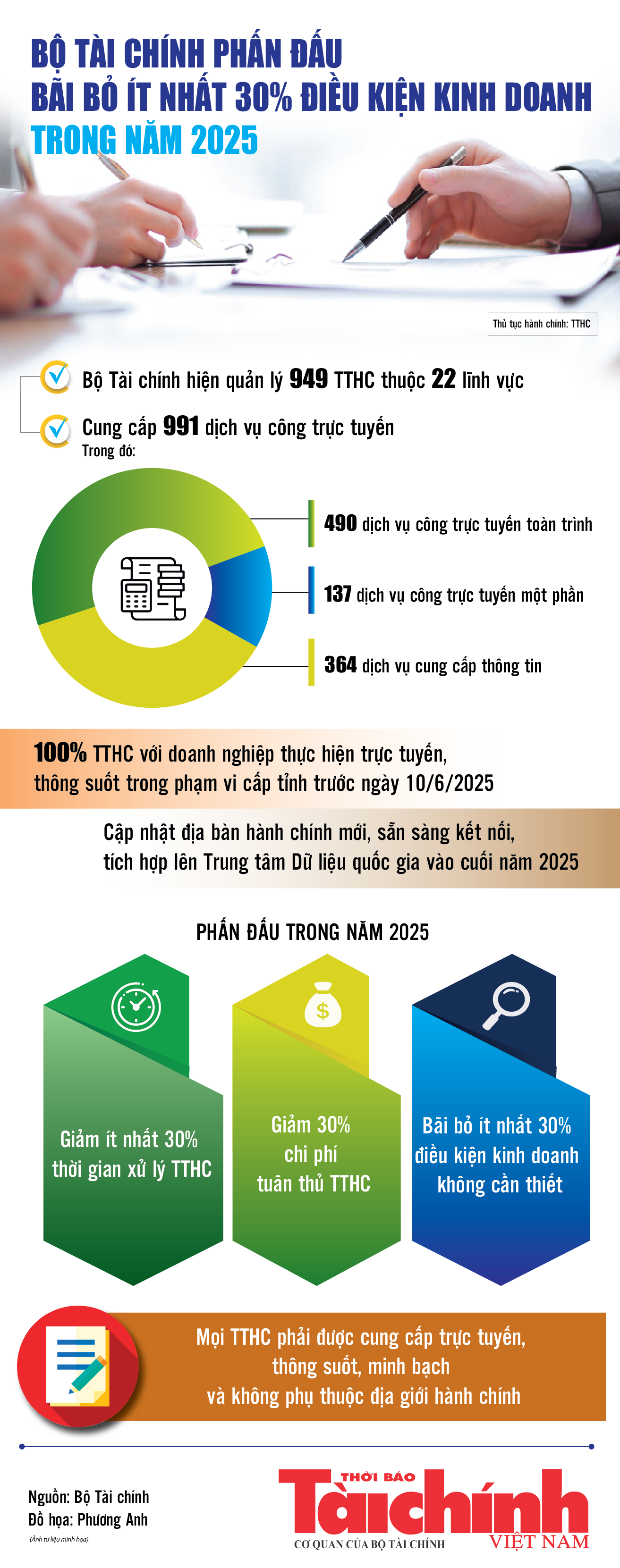 Theo Bộ Tài chính, trong năm 2025, toàn hệ thống sẽ phấn đấu giảm ít nhất 30% thời gian xử lý thủ tục hành chính (TTHC), giảm 30% chi phí tuân thủ TTHC, bãi bỏ ít nhất 30% điều kiện kinh doanh không cần thiết. Mọi TTHC liên quan đến doanh nghiệp phải được cung cấp trực tuyến, thông suốt, minh bạch và không phụ thuộc địa giới hành chính.