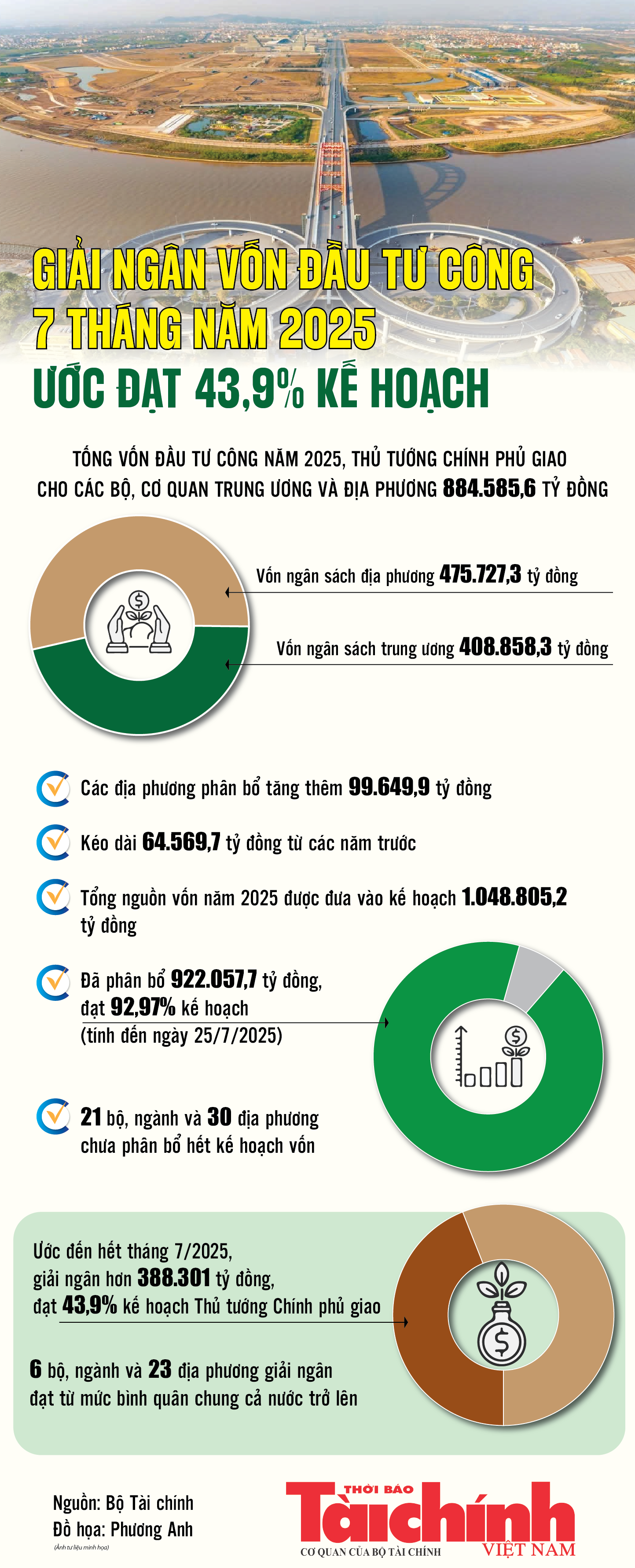 Theo Bộ Tài chính, ước giải ngân vốn đầu tư công đến hết tháng 7/2025 được hơn 388.301 tỷ đồng, đạt 43,9% kế hoạch Thủ tướng Chính phủ giao.