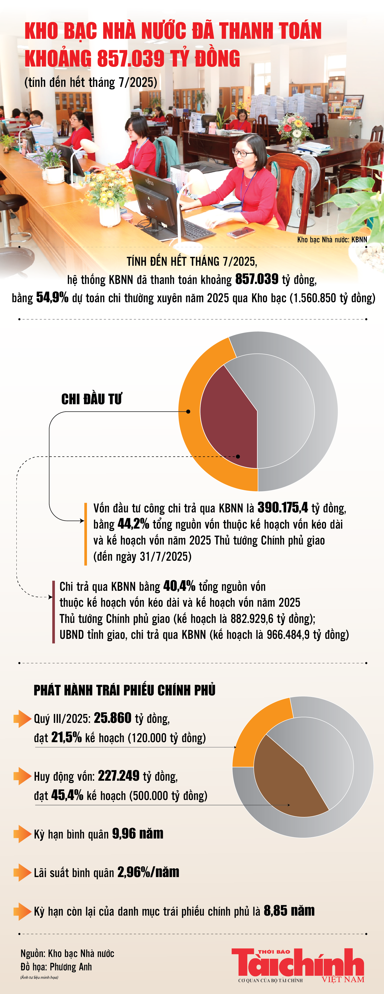 Tính đến hết tháng 7/2025, hệ thống Kho bạc Nhà nước đã thực hiện thanh toán khoảng 857.039 tỷ đồng, bằng 54,9% dự toán chi thường xuyên năm 2025 của ngân sách nhà nước qua Kho bạc (1.560.850 tỷ đồng), không bao gồm chi trả nợ, viện trợ, chi bổ sung quỹ dự trữ tài chính, dự phòng.