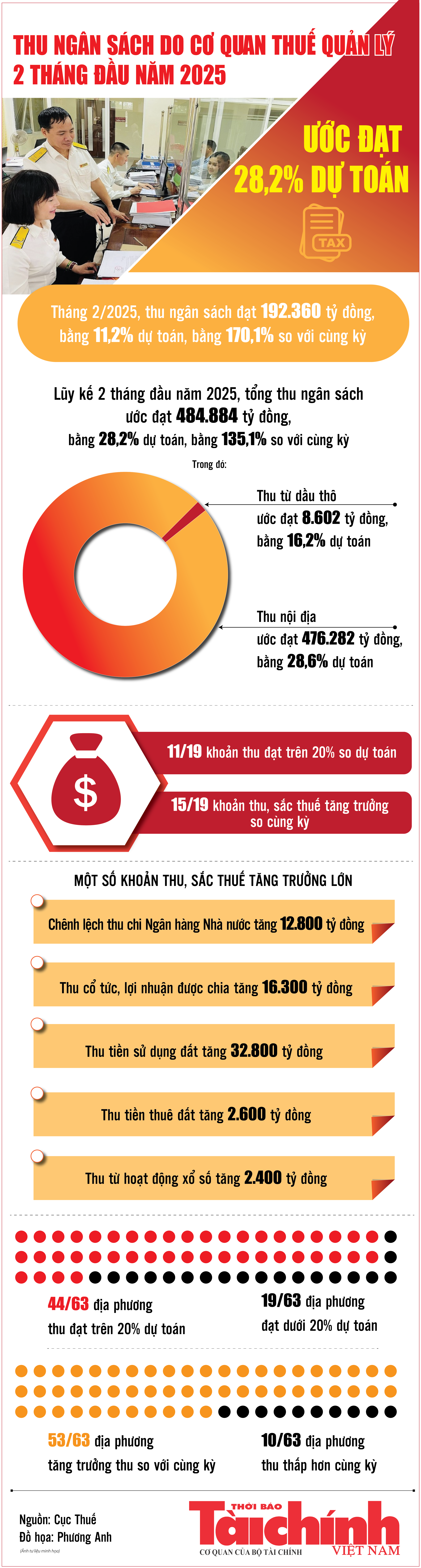 Theo báo cáo của Cục Thuế, lũy kế 2 tháng đầu năm 2025, tổng thu ngân sách nhà nước cơ quan thuế quản lý ước đạt 484.884 tỷ đồng, bằng 28,2% dự toán, bằng 135,1% so với cùng kỳ thực hiện.