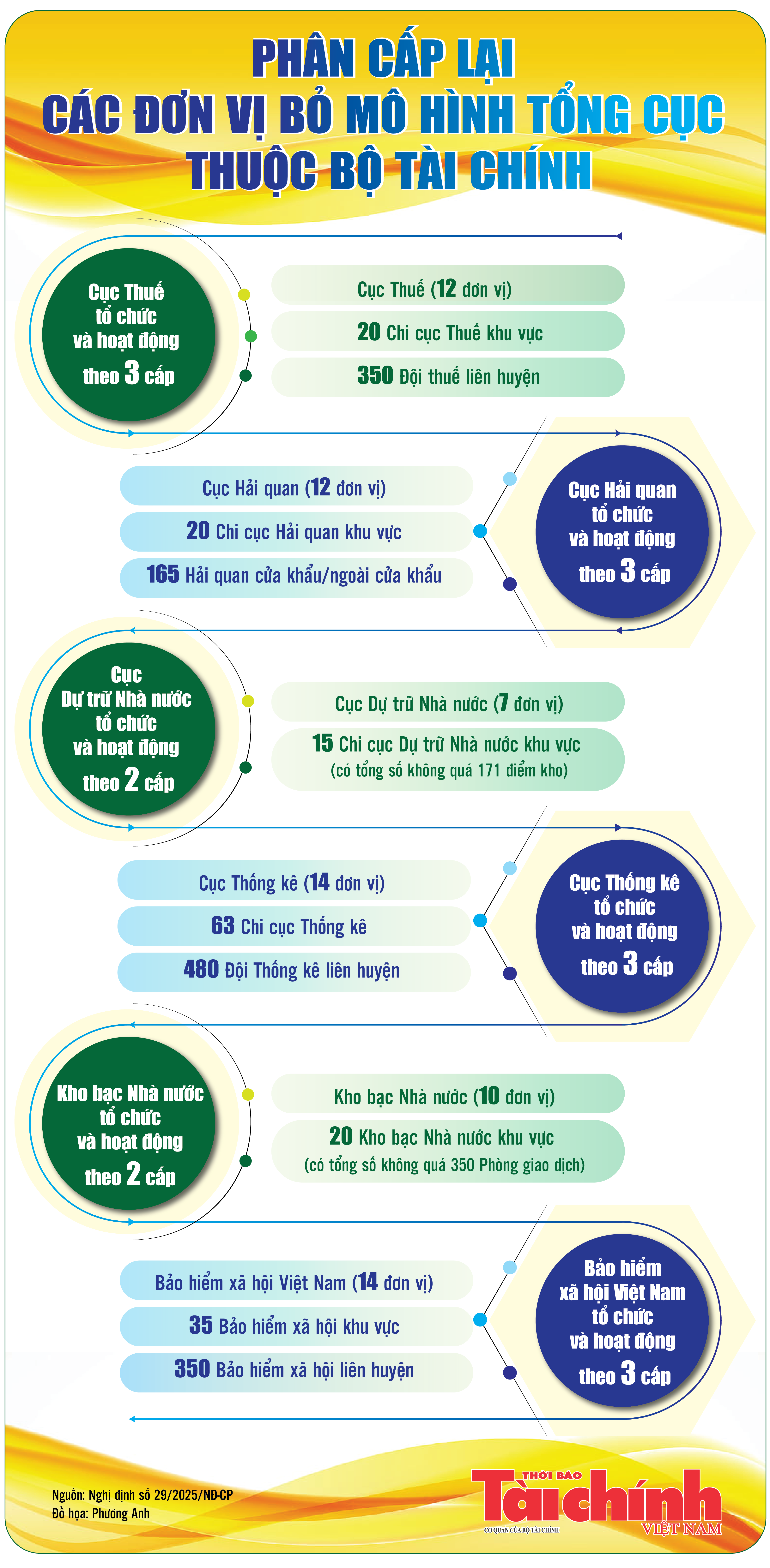 Theo các quyết định vừa được Bộ Tài chính ban hành, các đơn vị có mô hình Tổng cục sẽ chuyển thành Cục và hoạt động phân cấp. Cụ thể, Cục Thuế tổ chức và hoạt động theo 3 cấp; Cục Hải quan tổ chức và hoạt động theo 3 cấp; Cục Dự trữ Nhà nước tổ chức và hoạt động theo 2 cấp; Cục Thống kê tổ chức và hoạt động theo 3 cấp…