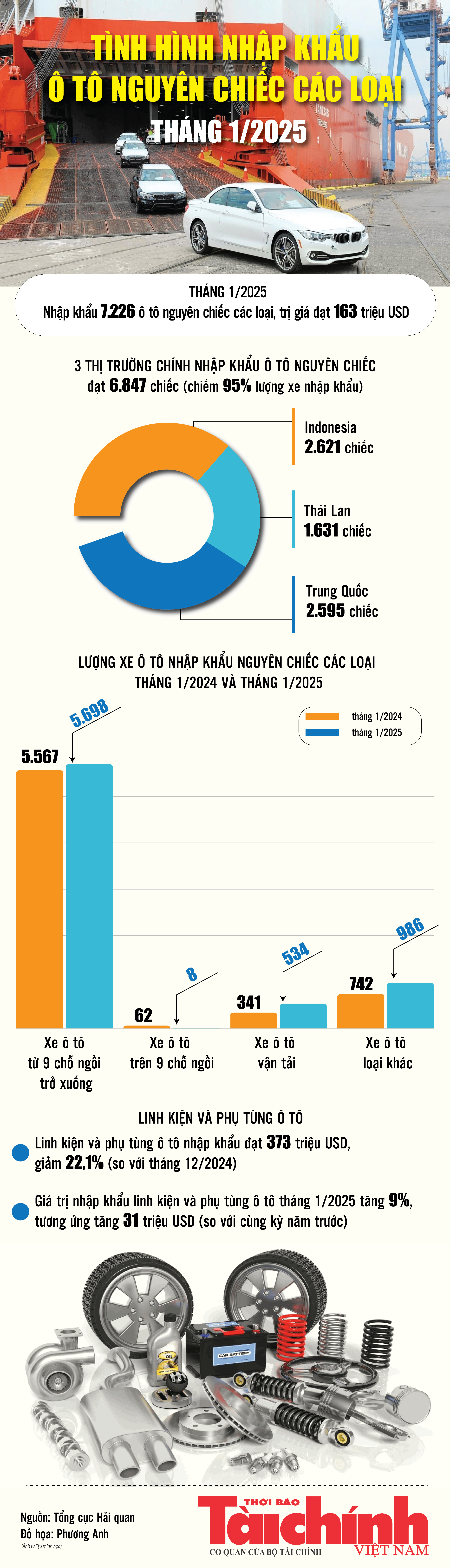 Theo số liệu của Tổng cục Hải quan, số xe ô tô nhập khẩu nguyên chiếc các loại trong tháng 1/2025 vào Việt Nam đạt 7.226 chiếc, tương ứng trị giá 163 triệu USD.