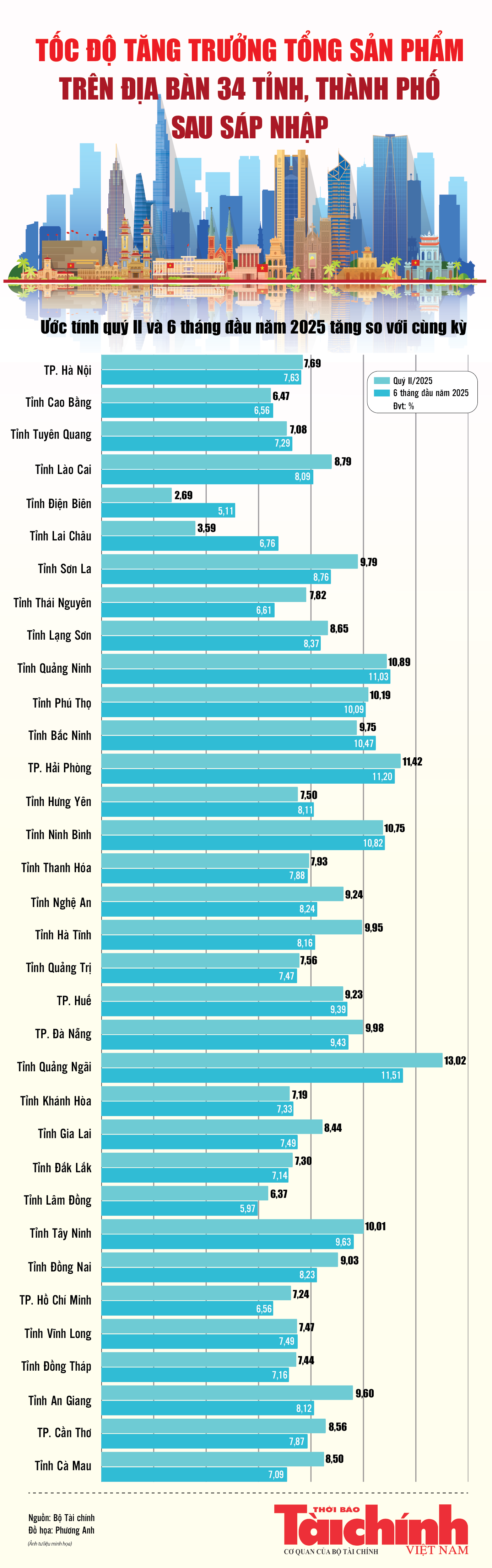 Infographics: Tốc độ tăng trưởng tổng sản phẩm trên địa bàn 34 tỉnh, thành phố sau sáp nhập