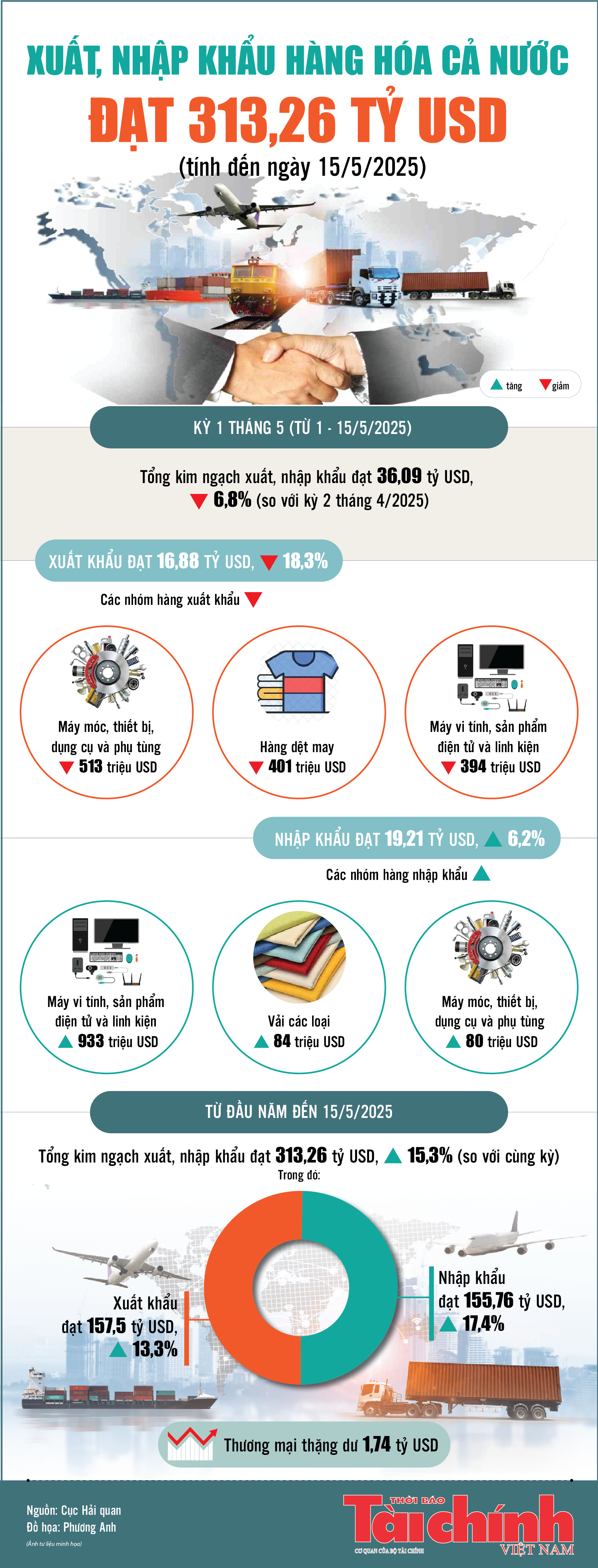 Theo Cục Hải quan, tính từ đầu năm đến 15/5/2025, quy mô kim ngạch xuất, nhập khẩu của nước ta đạt 313,26 tỷ USD. Trong đó, xuất khẩu đạt 157,5 tỷ USD; nhập khẩu đạt 155,76 tỷ USD; cán cân thương mại thặng dư 1,74 tỷ USD.