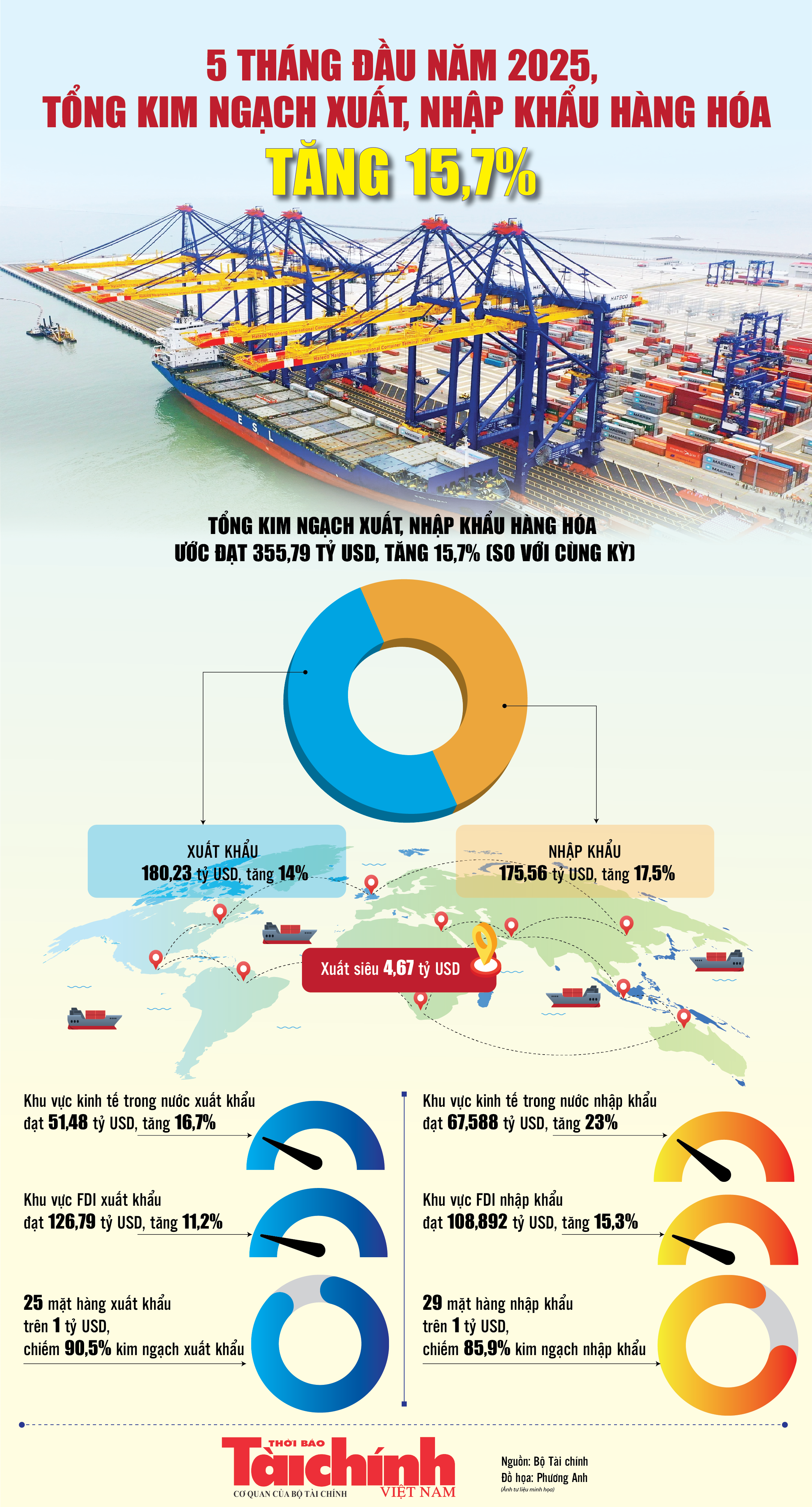 Theo Bộ Tài chính, 5 tháng đầu năm 2025, tổng kim ngạch xuất, nhập khẩu hàng hóa ước đạt 355,79 tỷ USD, tăng 15,7% so với cùng kỳ năm trước. Trong đó xuất khẩu tăng 14%; nhập khẩu tăng 17,5%. Cán cân thương mại hàng hóa xuất siêu 4,67 tỷ USD.