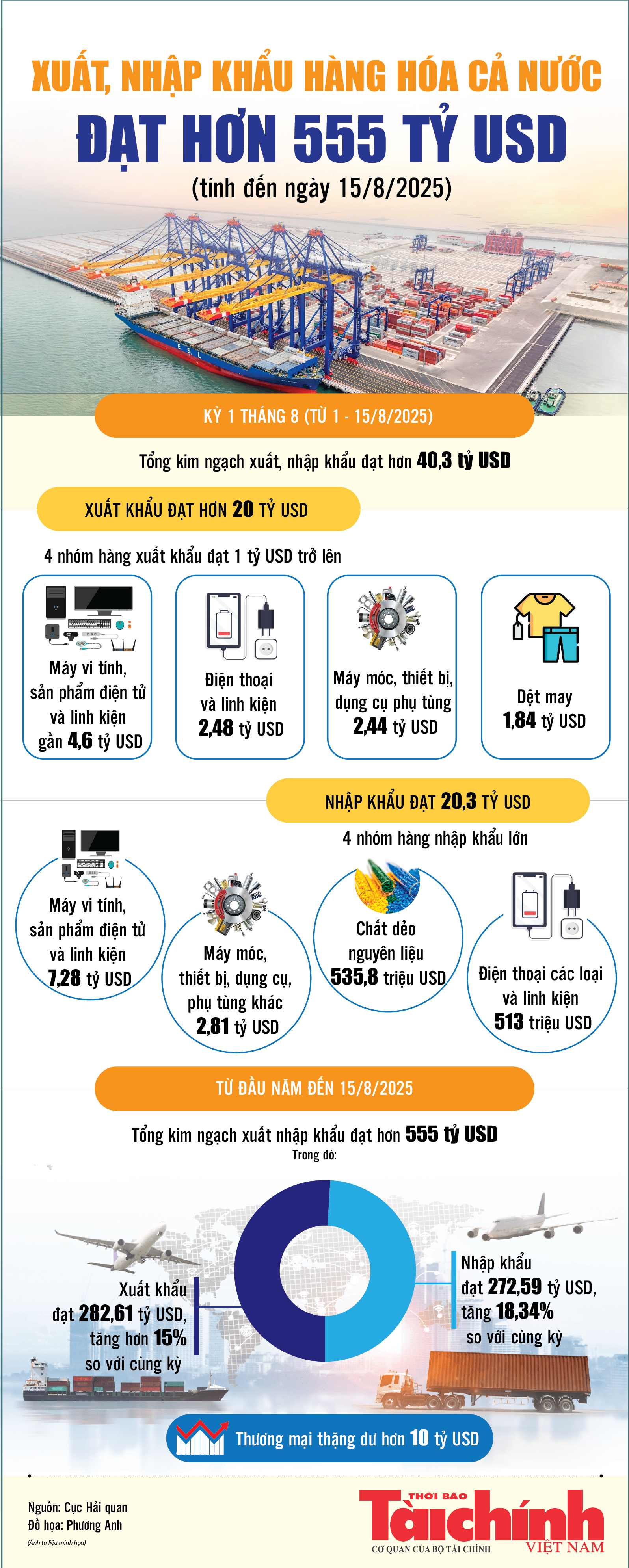 Theo Cục Hải quan, tính từ đầu năm đến 15/8/2025, quy mô kim ngạch xuất, nhập khẩu cả nước đạt hơn 555 tỷ USD. Trong đó, xuất khẩu đạt 282,61 tỷ USD; nhập khẩu đạt 272,59 tỷ USD; cán cân thương mại thặng dư hơn 10 tỷ USD.
