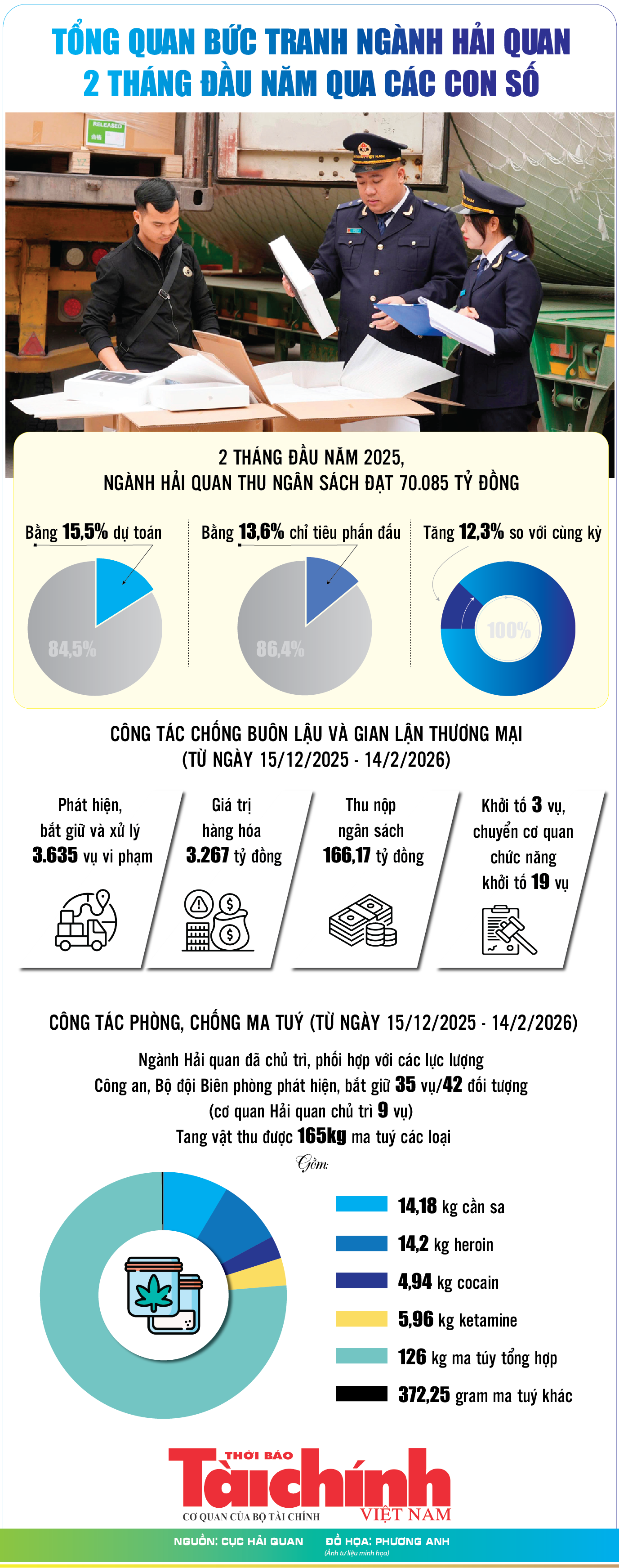 Theo Cục Hải quan (Bộ Tài chính), số thu ngân sách của ngành Hải quan từ hoạt động xuất, nhập khẩu 2 tháng ước đạt 70.085 tỷ đồng; phát hiện, bắt giữ và xử lý 3.635 vụ việc vi phạm; thu được 165kg ma tuý các loại… là những con số nổi bật trong 2 tháng đầu năm 2026.