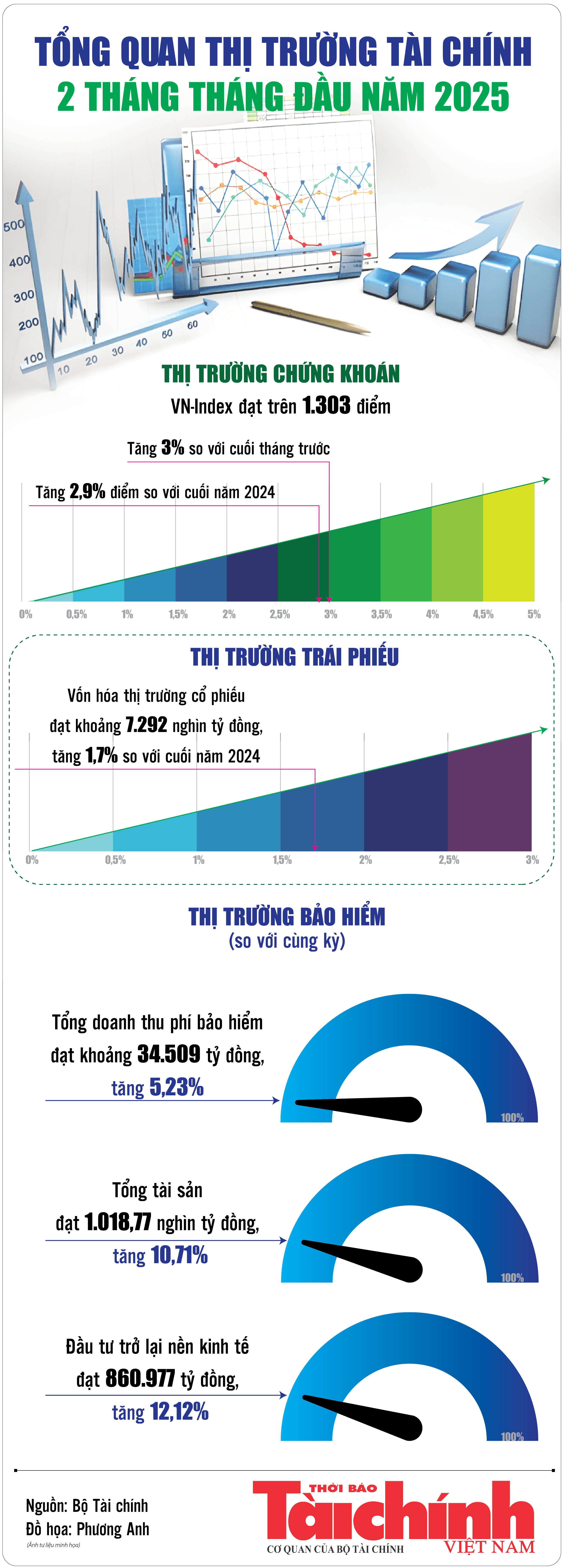 Theo Bộ Tài chính, tính đến cuối tháng 2/2025, VN-Index đạt trên 1.303 điểm; quy mô vốn hóa thị trường cổ phiếu đạt khoảng 7.292 nghìn tỷ đồng, tăng 1,7% so với cuối năm 2024; tổng doanh thu phí bảo hiểm đạt khoảng 34.509 tỷ đồng, tăng 5,23% so với cùng kỳ.
