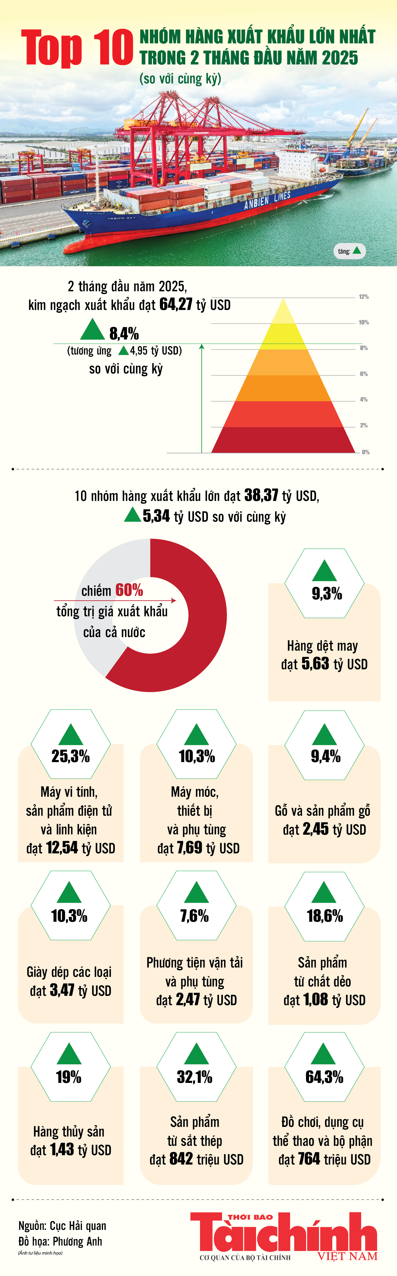 Theo số liệu của Cục Hải quan, 2 tháng đầu năm 2025, tổng trị giá xuất khẩu đạt 64,27 tỷ USD, tăng 8,4% so với cùng kỳ năm trước. Trong đó, tổng trị giá xuất khẩu 10 nhóm hàng lớn nhất đạt 38,37 tỷ USD, tăng 5,34 tỷ USD so với cùng kỳ năm trước và chiếm 60% tổng trị giá xuất khẩu của cả nước.
