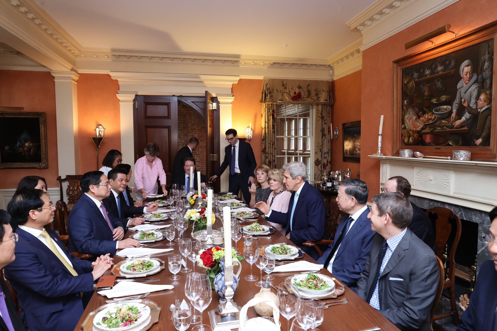 | Trong buổi ăn trưa, làm việc, Thủ tướng Phạm Minh Chính và Đặc phái viên John Kerry đã trao đổi về định hướng hợp tác ứng phó với biến đổi khí hậu và chuyển đổi năng lượng ở Việt Nam. |