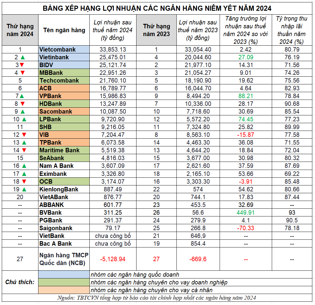 | "Sao đổi ngôi" ngành ngân hàng trong bảng xếp hạng lợi nhuận năm 2024. |