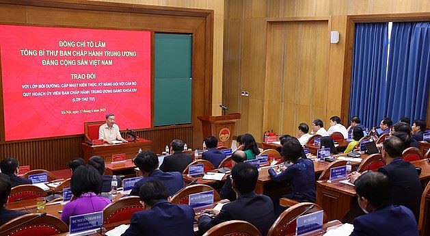 Chiều 17/6, tại Học viện Chính trị quốc gia Hồ Chí Minh, Tổng Bí thư Tô Lâm đã có buổi trao đổi với Lớp bồi dưỡng, cập nhật kiến thức, kỹ năng đối với cán bộ quy hoạch Ủy viên Ban Chấp hành Trung ương Đảng khóa XIV (lớp thứ tư) về mục tiêu tầm nhìn và một số chủ trương, giải pháp đột phá cần tập trung thực hiện để đưa đất nước bước vào kỷ nguyên mới.